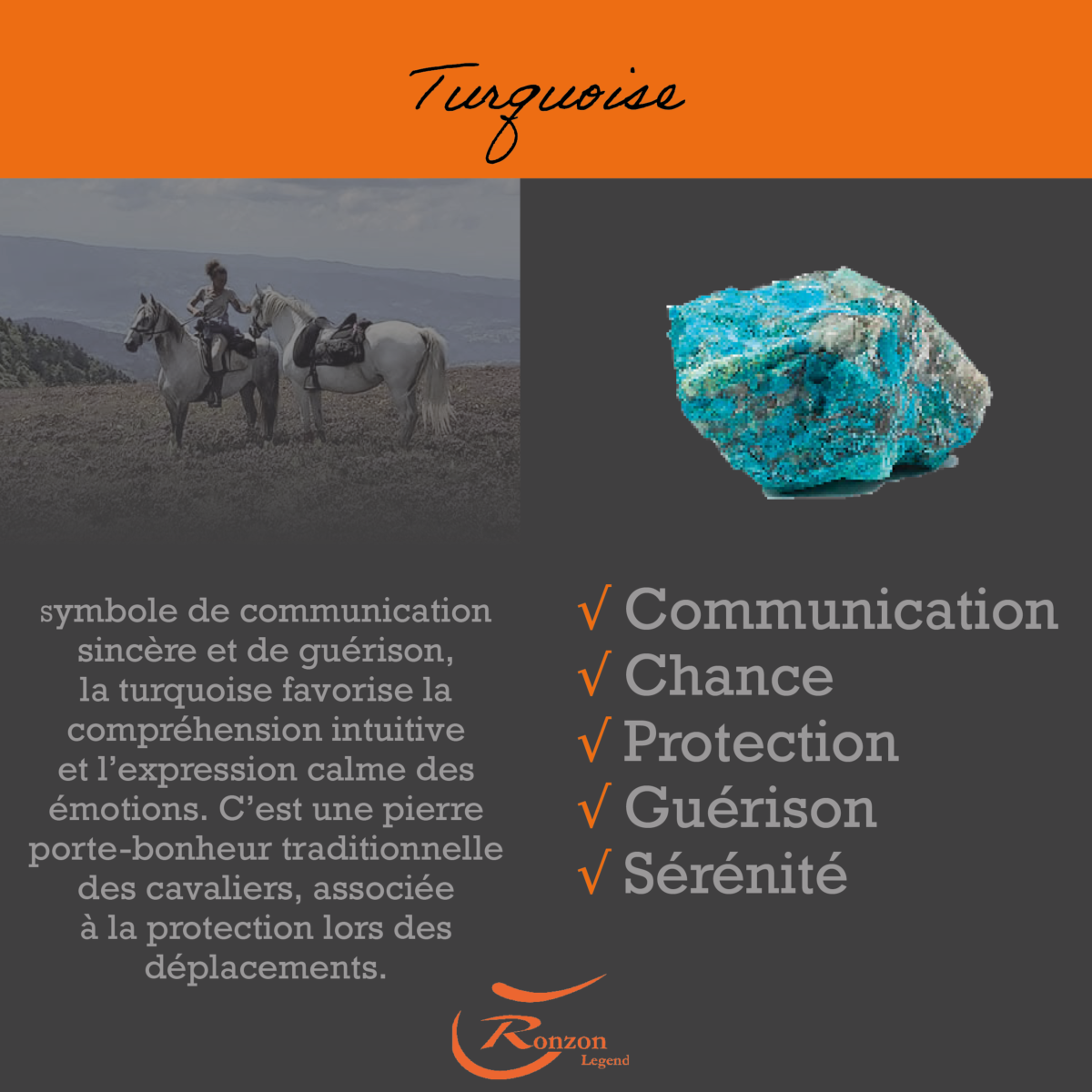 -Turquoise: Symbole de communication sincère et de guérison, la turquoise favorise la compréhension intuitive et l’expression calme des émotions. C’est une pierre porte-bonheur traditionnelle des cavaliers, associée à la protection lors des déplacements.