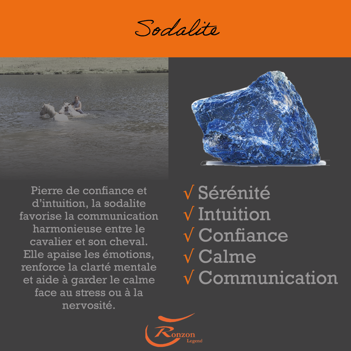 Elle harmonise la relation, guidant vers une connexion plus profonde et confiante. Pierre de confiance et d’intuition, la sodalite favorise la communication harmonieuse entre le cavalier et son cheval.