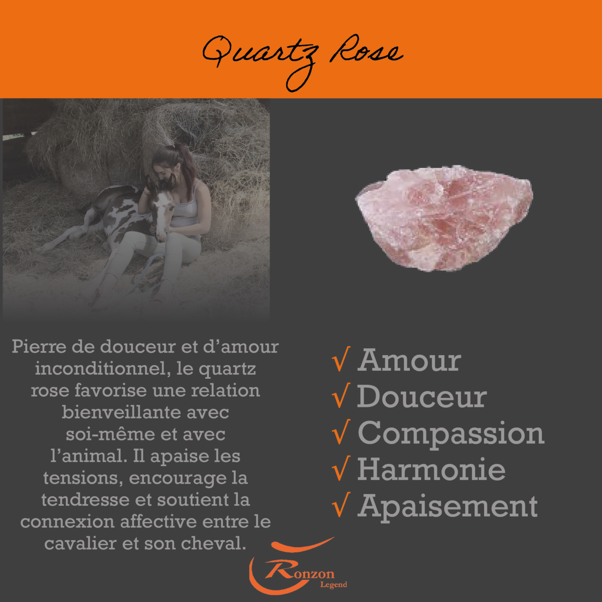 -Quartz Rose: Pierre de douceur et d’amour inconditionnel, le quartz rose favorise une relation bienveillante avec soi-même et avec l’animal. Il apaise les tensions, encourage la tendresse et soutient la connexion affective entre le cavalier et son cheval.