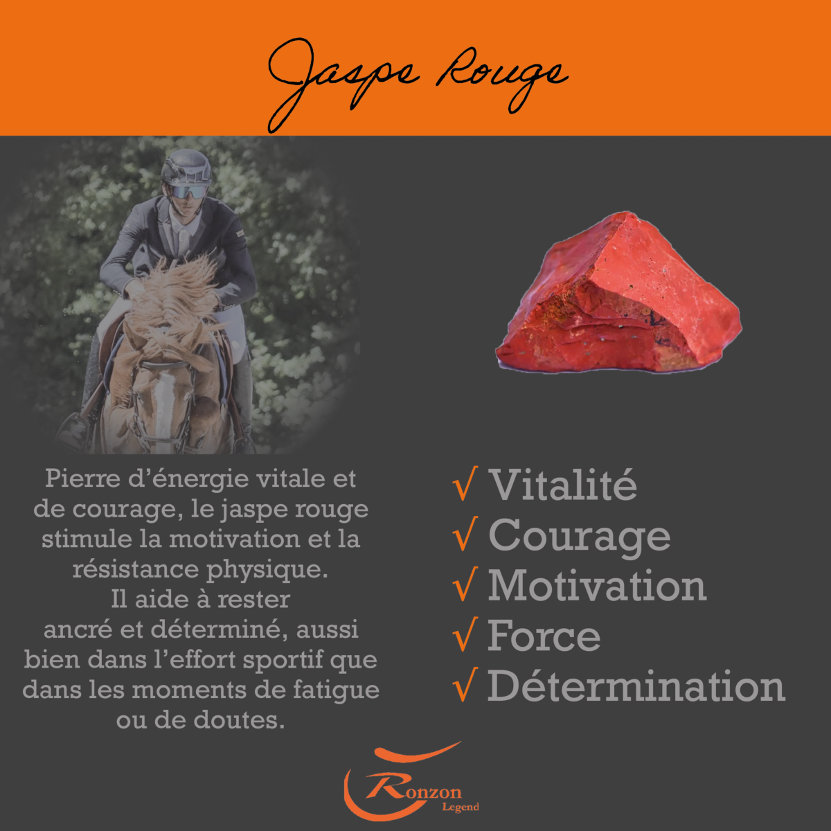 -Jaspe rouge: Pierre d’énergie vitale et de courage, le jaspe rouge stimule la motivation et la résistance physique. Il aide à rester ancré et déterminé, aussi bien dans l’effort sportif que dans les moments de fatigue ou de doutes.