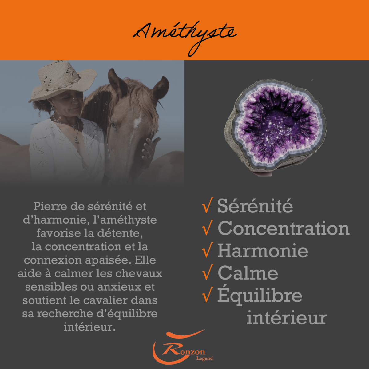 -Améthyste: Pierre de sérénité et d’harmonie, l’améthyste favorise la détente, la concentration et la connexion apaisée. Elle aide à calmer les chevaux sensibles ou anxieux et soutient le cavalier dans sa recherche d’équilibre intérieur.