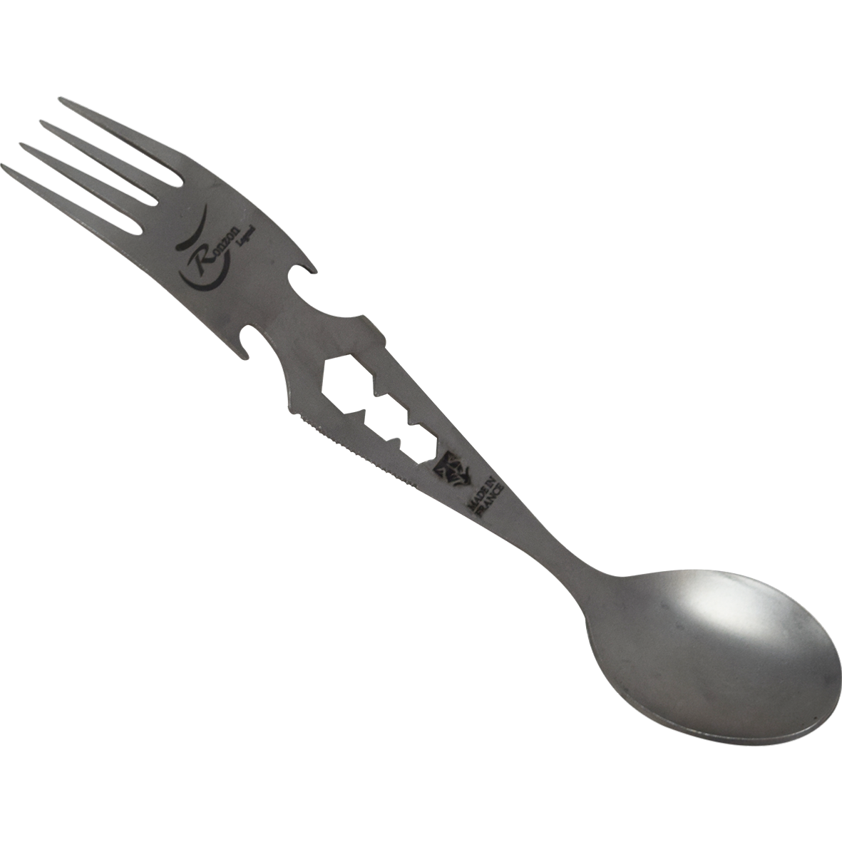 Six fonctions : fourchette, cuillère, décapsuleur, tournevis, micro-denture (pour amorcer la coupe des produits fragiles sans